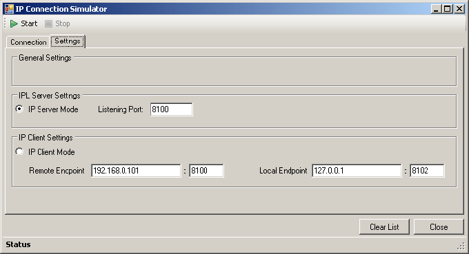 Dieses in C# und Visual Studio 2005 geschriebene Tool läßt sich im Server oder im Client Modus betreiben und simuliert eine TCP/IP Gegenstelle. Im Server Modus kann ein Listening Port angegeben werden. Im Client Modus kann die Remote IP Addresse und Port angegeben werden sowie die lokale IP Addresse und Port. Dies ist bei manchen Verbindungsarten (z.B. zu einer SPS) sehr wichtig und wird von einem normalen Telnet Client nicht unterstützt.
